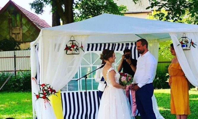 A polgári szertartást megtarthatjátok helyben, a Tahy-kastély tágas, zöld udvarán.